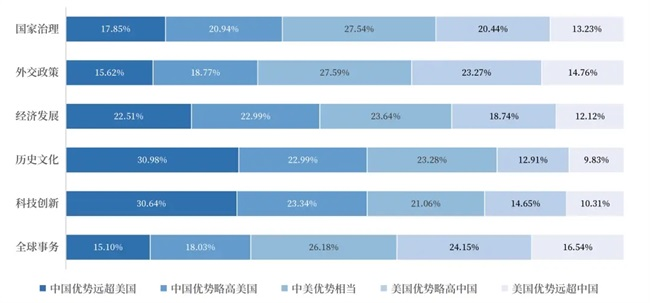 中国在经济发展、历史文化和科技创新方面获得更高的认可;美国则在外交政策和全球事务领域保持传统影响力。双方在大多数领域均未形成绝对领先。