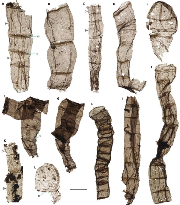 化石保存为有机质壁构成的多细胞丝状体,显示细胞大小和形态的变化引起的丝状体形态变化。丝状体直径向一端收缩(A-D、F-I、K),丝状体直径不变(J),保存有完整端部的丝状体(E、L)。比例尺对于F-H和K代表100微米,其余的代表50微米。