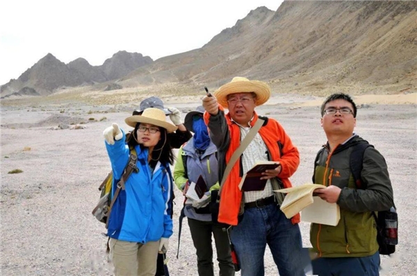 苗兰云(左一)与朱茂炎老师(中间穿橘黄色上衣)、胡春林(右一)等人在野外考察