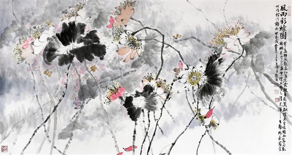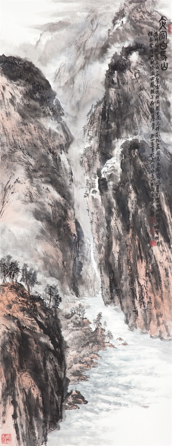 山水画承载着很多的传统文化精神,王维禅画山水,范宽以山水立骨传神,沈周依山水澄怀观道,石涛曰山水时有论笔墨当随时代。锁平先生创作山水,像写书法一样深深因循山水里的文化龙脉,带着为天地张目的精气神对境造意,也是通过山水创作独与天地精神往来的丹青贤家!他作山水,深谙六法之论,完全是一派笔墨精彩的孤标尘外!请看《盤江印象图》这一件惟妙的山水佳作,执笔作线,骨法峥嵘,勾下一笔滑畅劲健,复作勒笔钢打铁铸。这正是骨法用笔的精湛,把中国画依线条造型的本质表现得无以复加!无有一根线条凌乱,不让一笔失控而成为散兵游勇!又有诸多皴法的灵活调度,可以让笔法呈现千变万化,斧劈皴雄奇,折带皴错落,雨点皴空蒙,披麻皴生机。好的笔法就是其山水作品专业品质高能,让人无可挑剔的重要原因。