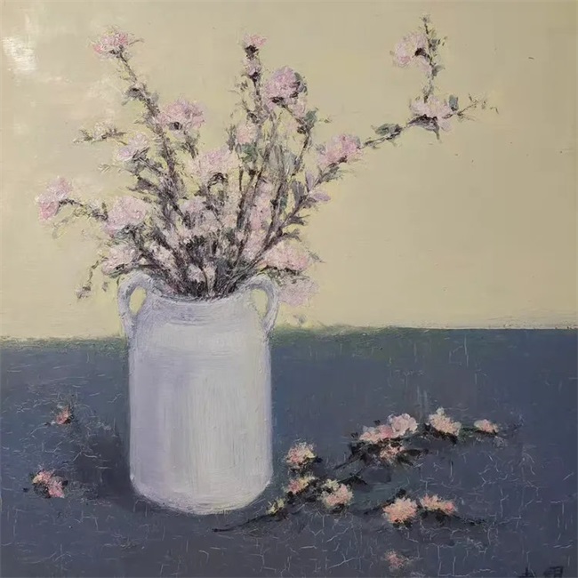白罐藏春,粉花映暖,以油彩写尽人间春日温柔。