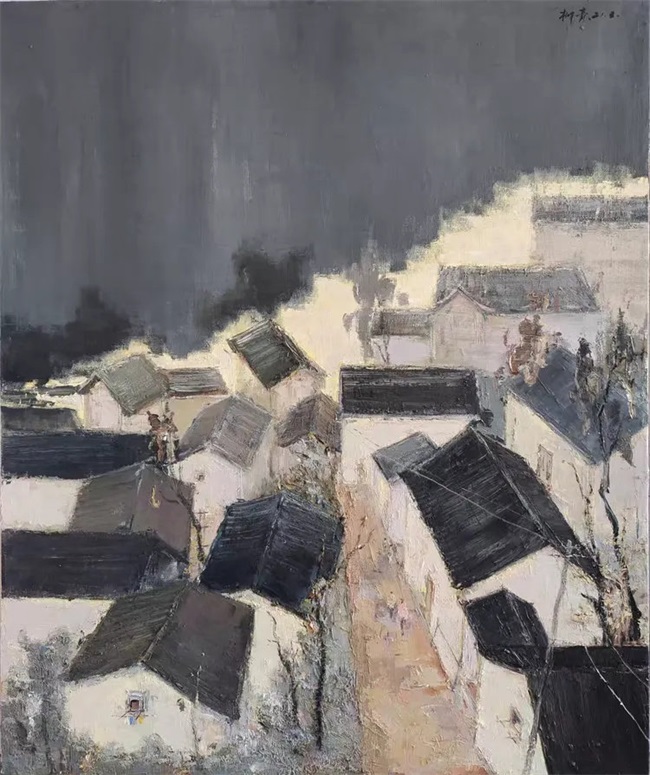 暗天幕为底,白雪覆屋舍,厚涂油彩间写尽冬日清寂