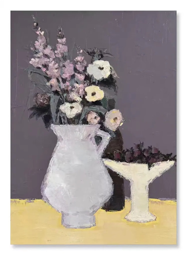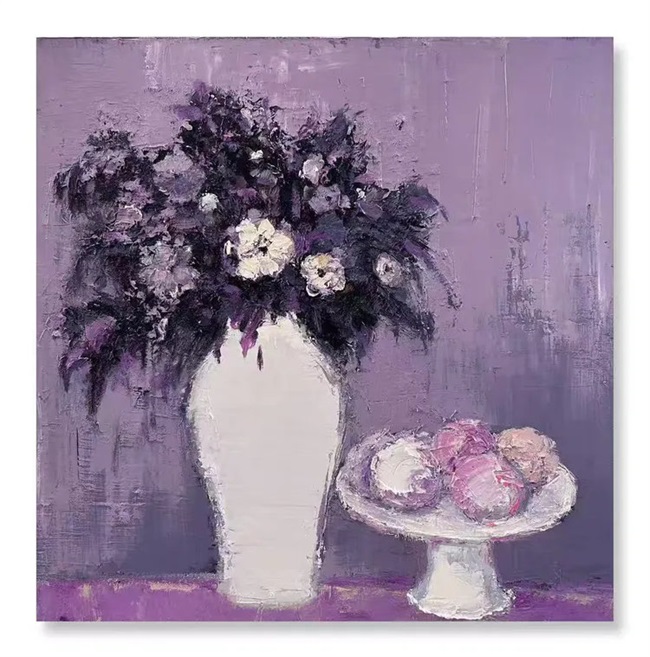 以莫兰迪紫为底,白瓷承繁花,厚涂肌理间尽显生活温度