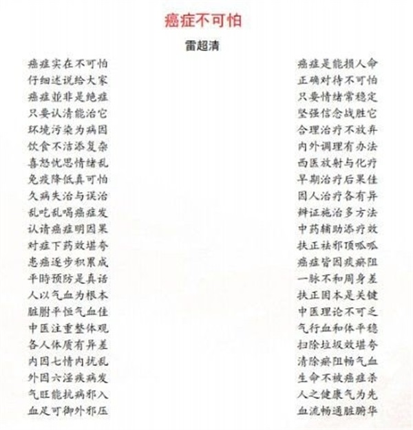 多年临床中,雷超清见证了无数癌症患者的痛苦,深知传统抗癌之路的艰难。他潜心梳理数十年诊疗案例,总结 “元气戕伤与癌变相关性” 等核心观点,撰写出版《抗癌必读》,系统分享中医治癌经验。