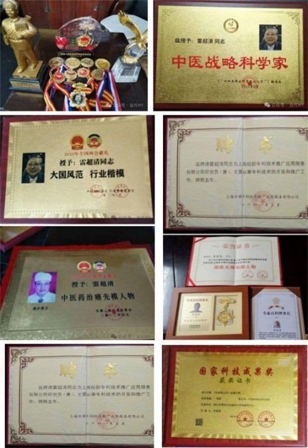 除了在癌症防治领域的突破,雷超清还攻克了诸多疑难杂症,风湿、类风湿、骨髓炎、乙肝、胆结石、腰椎间盘突出、肾病综合征、中风偏瘫、不孕症、癫痫等病症,在他的诊疗下均有患者康复。他还先后研发出治疗感冒咳嗽的中草药药膏(专利号:ZL200610124779.3)、替代抗生素的中药制剂(专利号:ZL2007100528718),其中感冒咳嗽药膏集温、润、清、宣于一体,对小儿外感咳嗽疗效显著,而抗菌中药内服外用皆可,对皮肤化脓性感染效果突出,多项专利成果填补了基层医疗相关领域的空白。