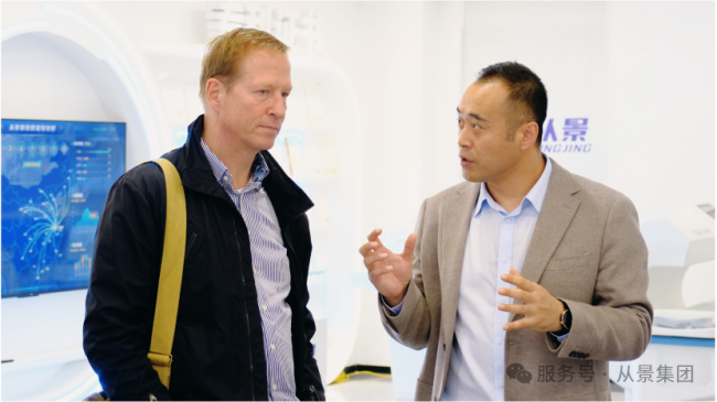 施耐德教授与从景集团副总裁景志强一行步入从景集团现代化展厅。展厅内,从景三十余年的发展历程、百余项专利墙、核心产品阵列展示,构成了一幅中国高新技术企业成长与创新的全景图。